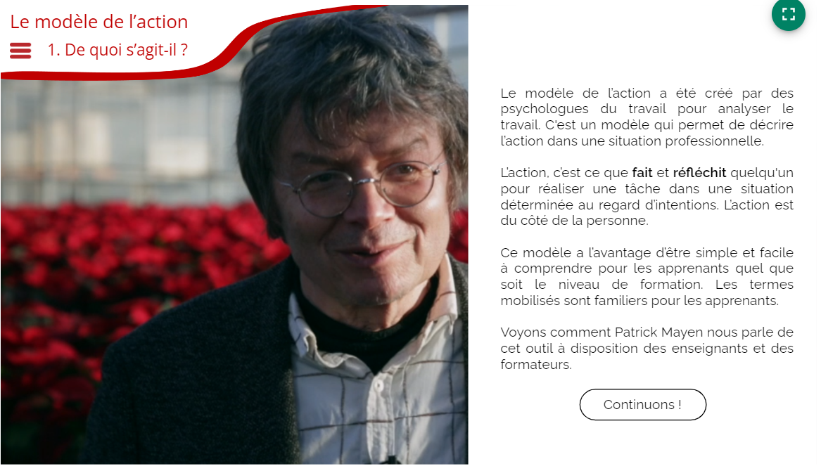 Elle permet de se familiariser avec le modèle de l’action qui a été créé par des psychologues du travail pour analyser le travail. C'est un modèle qui permet de décrire l’action dans une situation professionnelle.