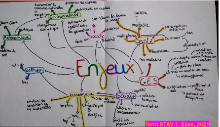 L’un des axes du PLEPA de Sees est de monter des projets partagés entre professeurs, agents et jeunes. A des élèves de STAV, leur équipe enseignante leur propose de mener des entretiens stratégiques (entretiens proposés par Reso’them et revisités) auprès de personnels de l’établissement : le DEA, les agents de cuisine, le directeur de centre équestre, le gestionnaire. La préparation des entretiens est l’occasion de leur faire élaborer une carte mentale des transitions, puis d’approfondir des concepts clés liés à la durabilité et aux transitions agroécologiques